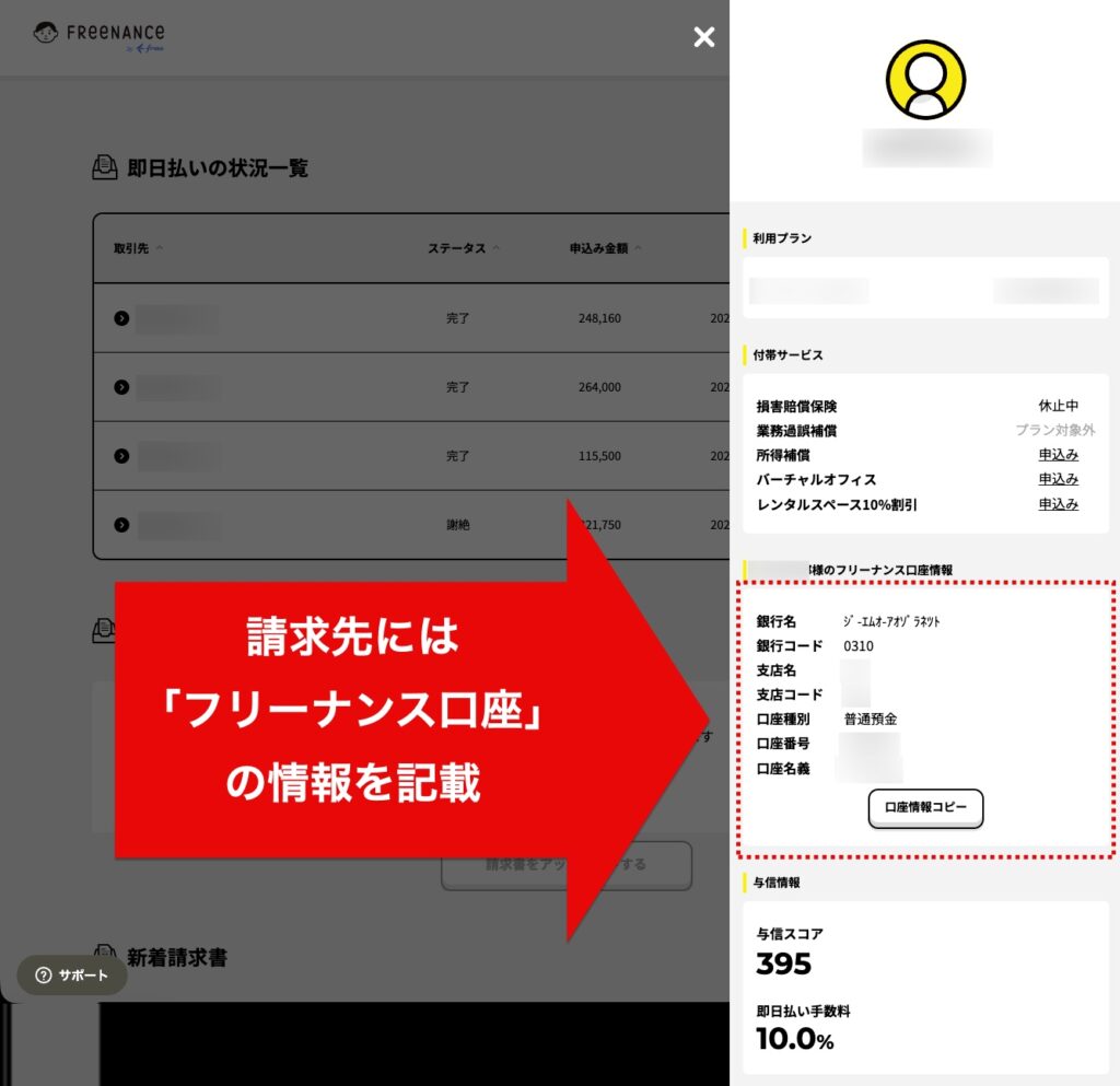 また、「即日払い」を利用しない場合でも、屋号名義の口座を簡単に作れ、業務上の保険といったサポートを無料で受けられるため、口座開設をしておくと何かと便利です。