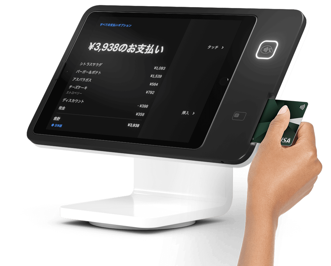 Squareが提供する決済端末搭載のiPad専用スタンド。手持ちのiPadをセットするだけで、月額無料のSquare POSレジと連動した本格的な会計端末として使えます。